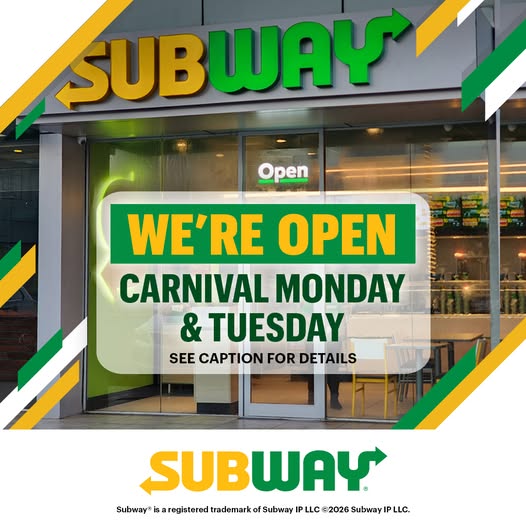 👏🏽 SUBWAY IS OPEN!!!! 🚪 📝 Our restaurants’ regular opening hours remain in place on Carnival Monday and Tuesday, except for the following which will be closed on both days: ⛔ Henry Street ⛔ Queen & Edward Streets ⛔ Frederick St ⛔ UWI ⛔ Gulf City Mall These locations will be open until midnight on both days: 📍 Ariapita Ave 📍 Arima 📍 San Juan 📍Valsayn 📍 La Romaine From tonight (Sunday) until Tuesday, our Piarco restaurant will close at 10:30 pm and reopen at 6 am on the following day. 🎊 Please have a Safe and Healthy Carnival and see you on the road. 🎉